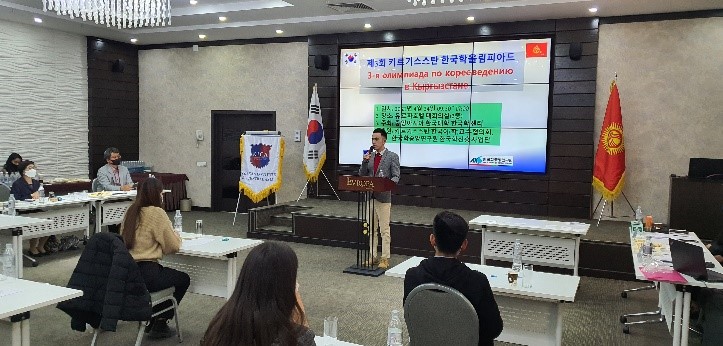 2021년 4월 24일(토) 비슈케크 소재 유로파호텔 대회의실(2층)에서 ‘제3회 키르기스스탄 한국학올림피아드(이하 올림피아드)’가 개최되었다. 본 올림피아드는 ‘중앙아시아 한국대학’의 한국학센터가 주최를 하고, 키르기스스탄 한국어(학)교수협의회와 한국 한국학중앙연구원의 한국학진흥사업단이 후원을 하였다. 2019년 키르기스스탄에서는 처음으로 개최된 본 올림피아드는 올해로 3회를 맞이 하였다. 키르기스스탄에서도 코로나 19 상황이 계속되고 있지만 대학에서 한국어와 한국학을 공부하고 있는 대학생 대상의 중요한 학술행사이기 때문에 대면으로 올림피아드를 개최하게 되었다. 다만 본 올림피아드는 코로나를 대비한 방역에 만전을 기하였고, 행사장은 참가자들의 거리두기 공간을 충분히 확보한 채 진행이 되었다.