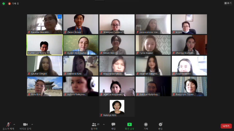 금년에도코로나상황으로인해서작년과마찬가지로온라인으로한국학올림피아드가개최되었다. 2021년4월29일카자흐국립대에서는동양학(한국역사, 문화) 분야에서행사가진행되었는데, 오랫동안갈고닦아온실력을발휘해볼수있는경연의장이라는점에서의미있는대회라고할수있다. 행사에는카자흐국립대한국학과를비롯하여, 카자흐국제관계및세계언어대, 유라시아국립대등의학생들이참가를했다. 한국학주간첫날행사로서진행된한국학올림피아드에서한국학과 3학년칼리예바굴덴이 1위를수상하였고, 4학년오테겐가우하르, 바쿰바이크즈아루잔이각각 2위와 3위를차지했다. 올림피아드를통해각자의한국어능력을겨루고그동안배운한국의역사와문화를점검하는유익한시간이되었다.